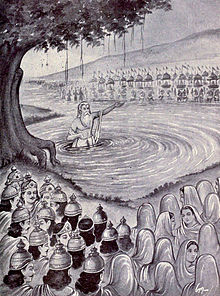 ಆಗ ನೀರಿನಿಂದ ಮೇಲಕ್ಕೆ ಭೀಷ್ಮ-ದ್ರೋಣರನ್ನು ಮುಂದಿಟ್ಟುಕೊಂಡು ಎಲ್ಲ ಪಾರ್ಥಿವರೂ, ಸೇನೆಗಳೊಂದಿಗೆ, ಸಹಸ್ರಾರು ಸಂಖ್ಯೆಗಳಲ್ಲಿ ಮೇಲೆದ್ದರು.