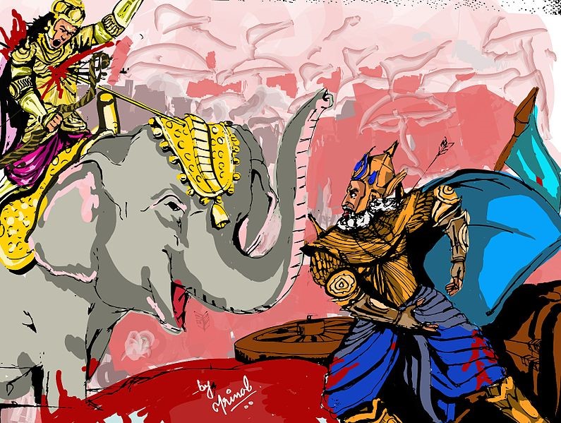 ಶರವ್ರಾತದಿಂದ ಮರ್ಮಗಳಲ್ಲಿ ಪೆಟ್ಟುತಿಂದು, ಸೊಂಡಿಲು ತುಂಡಾಗಿದ್ದ ಆ ಆನೆಯು ಭಯಂಕರ ಆರ್ತಸ್ವರವನ್ನು ಕೂಗಿ ಬಿದ್ದು ಅಸುನೀಗಿತು.