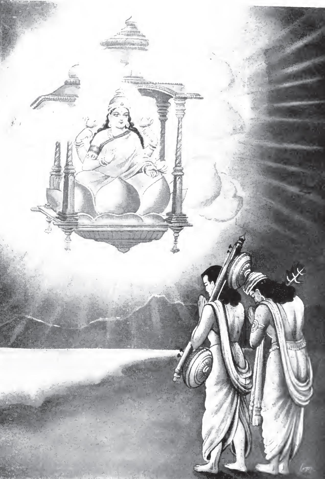 ಆ ವಿಮಾನದಲ್ಲಿ ಅವರು ತನ್ನಂತೆಯೇ ದಿವ್ಯ ರೂಪ-ಶೋಭೆಗಳನ್ನು ಹೊಂದಿದ್ದ ಅಪ್ಸರೆಯರಿಂದ ಸುತ್ತುವರೆಯಲ್ಪಟ್ಟ, ಅಂಶುಮಾಲಿ ಸೂರ್ಯನ ತೇಜಸ್ಸಿಗೆ ಸಮಾನ ತೇಜಸ್ಸಿನಿಂದ ಕೂಡಿ ಅಗ್ನಿಯ ಜ್ವಾಲೆಯಂತೆ ಜಾಜ್ಜ್ವಲ್ಯಮಾನಳಾಗಿದ್ದ, ನಕ್ಷತ್ರಗಳಂತೆ ಥಳಥಳಿಸುವ ಆಭರಣಗಳನ್ನೂ, ಮುತ್ತು-ರತ್ನಗಳ ಹಾರಗಳನ್ನೂ ಧರಿಸಿದ್ದ, ಕಮಲದ ಮಧ್ಯದಲ್ಲಿ ಕುಳಿತಿದ್ದ ಬೃಹದಾಕಾರದ ಸಾಕ್ಷಾತ್ ಶ್ರೀಯನ್ನು ನೋಡಿದರು.